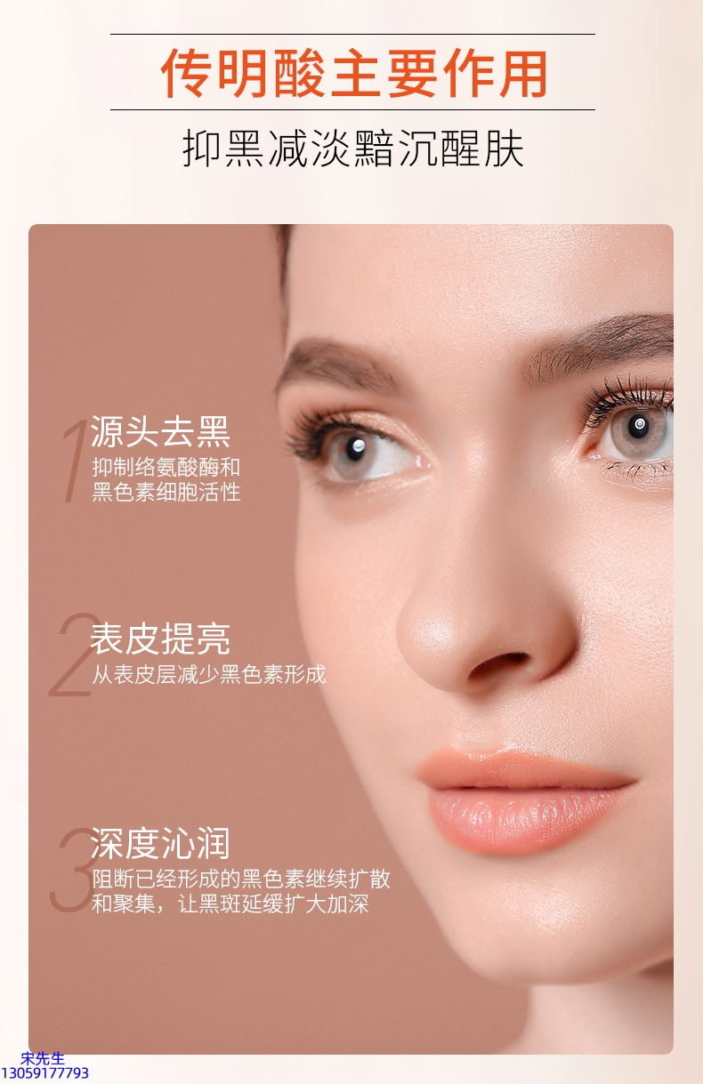 紫外线会激发酪氨酸酶,使黑色素蛋白数量增加,肤色持续加深。传明酸能防止晒后肌肤色素沉淀,无刺激、光敏感度低。